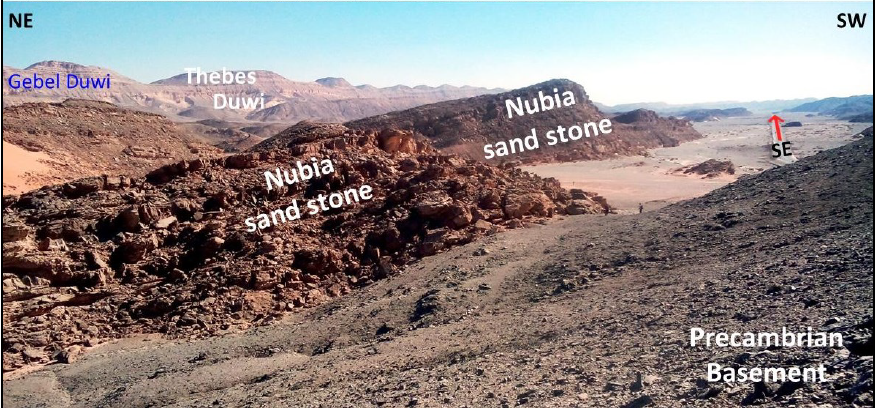 Field photograph of Gebel Duwi area, showing the geometry of tilted pre-rift Cretaceous Nubia sandstone on basement.
